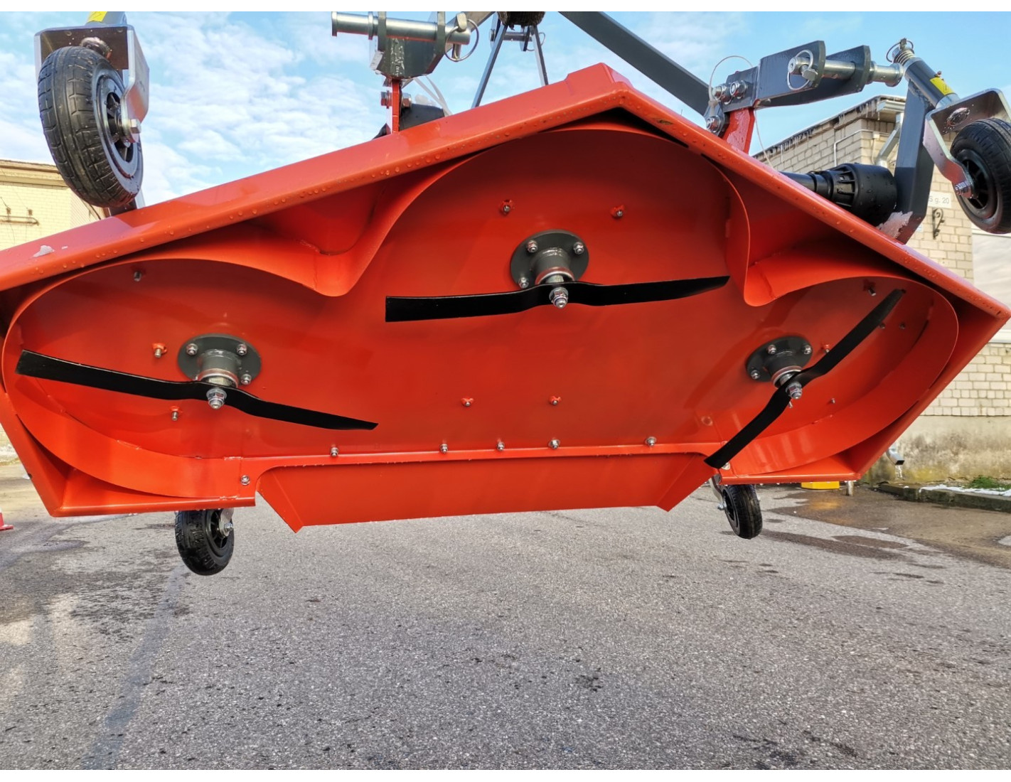 "Mateng" FM180 - a lawnmower of simple and lightweight construction, designed for lawn and garden maintenance, mowing flat lawns and meadows. The grass cut and chopped with this lawnmower remains on the surface as organic fertilizer. Perfectly suited for tractors from 25 HP (horsepower). The lawnmower is attached to the rear of the tractor to the three-point hitch system, driven at a speed of 540 rpm from the power take-off shaft (PTO). The angular reducer transmits rotation through two belts to the blade axes. The FM180 lawnmower is equipped with three cutting blades, one of which is 61 centimeters long. The grass cutting height is adjusted with support wheels.